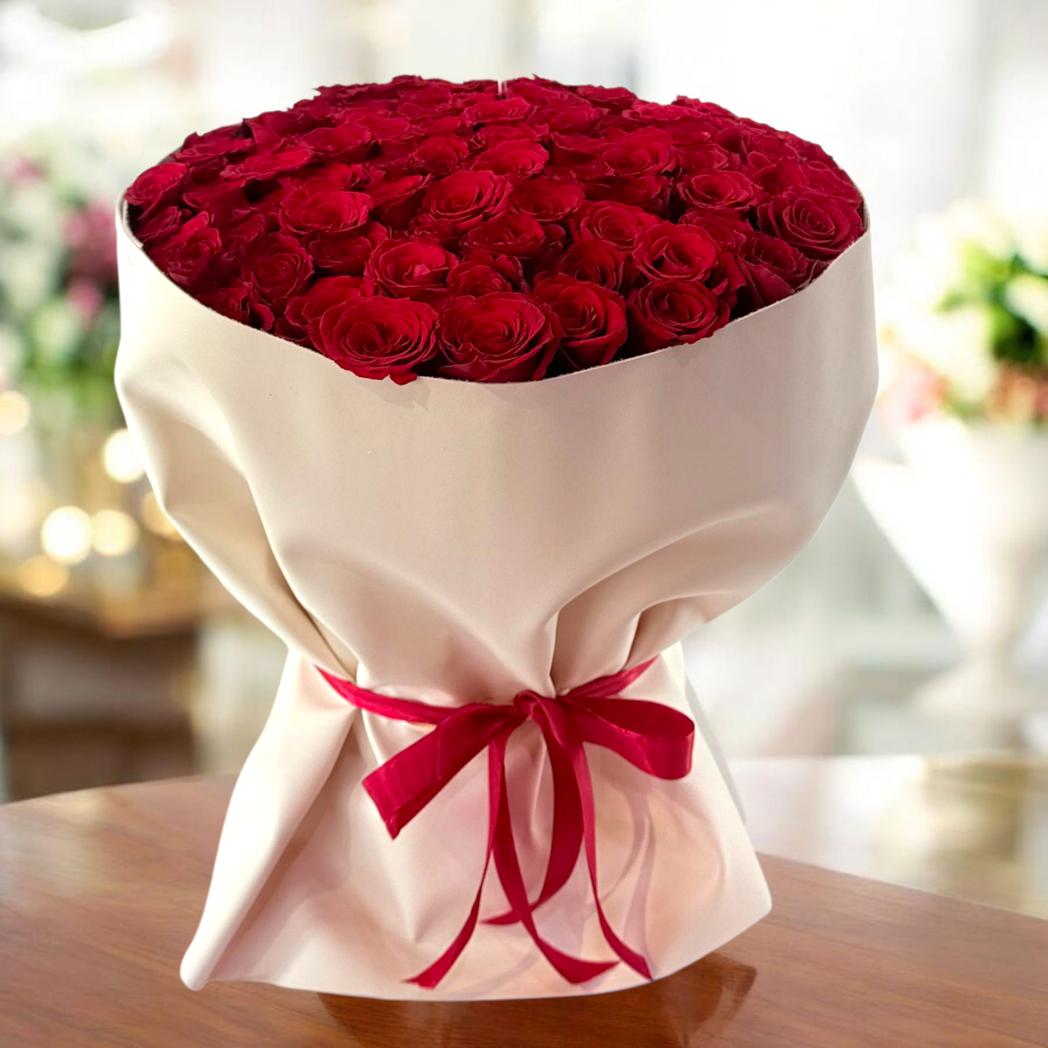 باقة 100 وردة جوري تغليف جلد ( بي امكان العميل تغير لون الورد قبل التنفيذ التواصل معنا عبر خدمة العملاء)